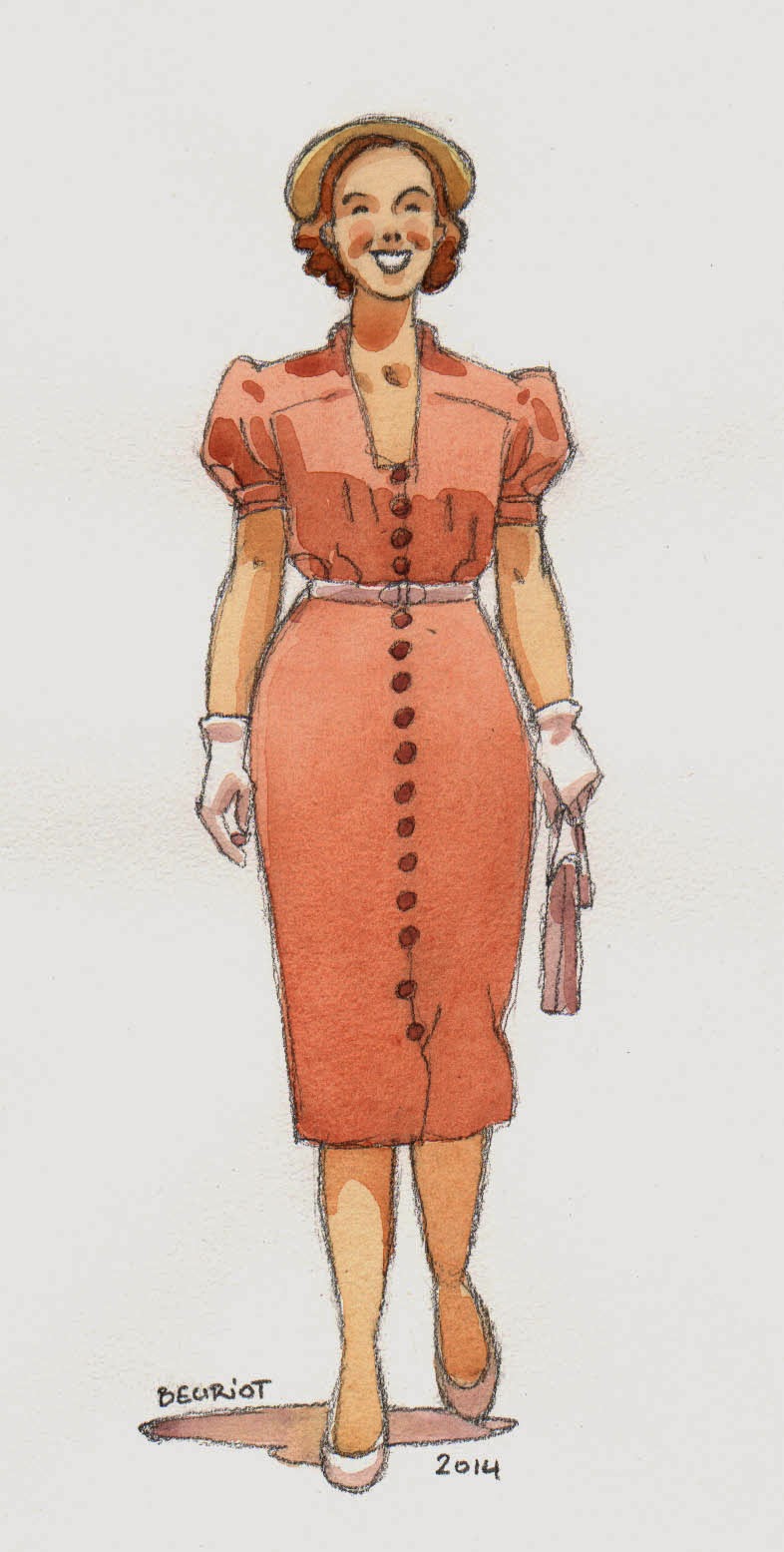 Aquarelle de Beuriot - Fille en robe rouge et chapeau de paille